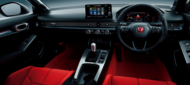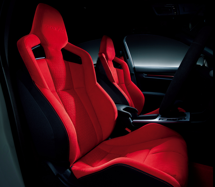 內裝承襲了Type R一貫的風格以紅色的跑車座椅、車室地毯與座椅安全帶來傳達其性能屬性,讓車主一坐進車內情緒就亢奮起來。前方控台則以黑色為基調,駕駛介面也盡量集中讓駕駛者好閱讀與操作。前座的跑車座椅採取多面體的3D立體形狀設計,在進行激烈操駕時能給予駕駛者優異的支撐,且以摩擦係數較高的類麂皮材質包覆,降低車輛在高G值動態下駕駛者身體的滑動。