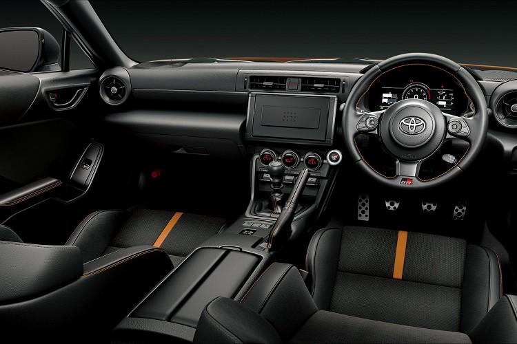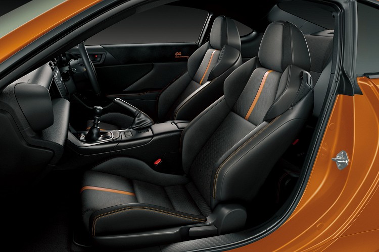 特殊的GR86是基於日本RZ車型上,僅提供火焰橘色車漆,不僅讓人聯想到十年前剛推出86時的特殊車色。多輻式18吋鋁圈圍黑色塗裝,與後視鏡蓋、保桿上裝飾蓋相互搭配。後擋風玻璃下方還有一張特殊的十周年紀念貼紙,告訴大家新世代86來自於2012年。當然GR86十周年,BRZ同樣也是,所以GR86使用亮橘色,反觀BRZ則是亮藍色,營造出強烈對比。