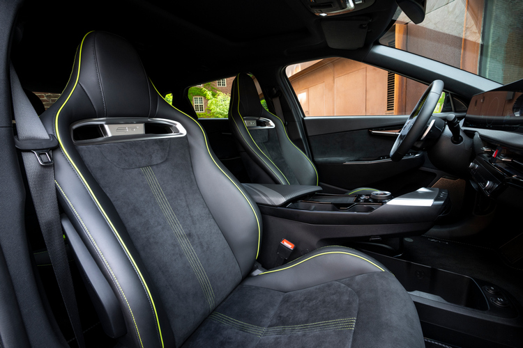 車室內結合運動感、舒適感與實用機能,所配的運動座椅以麂皮包覆,在激烈操駕時提供充分的支撐性而在長途行駛下又能提供優異的舒適度。車內可看到不少金屬與GT字樣的嵌飾,座椅則以螢光綠來收邊,營造科技感氛圍。副手座前方控台與中央肘枕都加入條紋圖案點出車子的運動風;車門與中控台、儀錶板等處的氣氛照明則在夜間讓乘客舒緩心情。