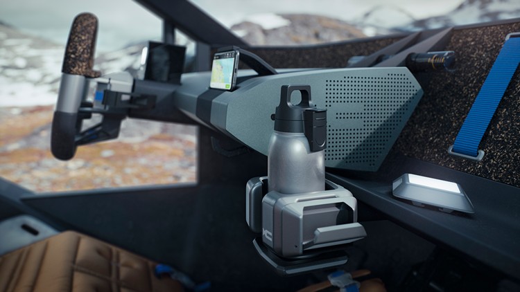 此外,後擋板也可作為享受戶外活動時,化身成為一處便利的工作平台。座艙內看不到中央螢幕,不過在接近大自然的同時,車內乘客仍可透過自己的智慧手機,與車上提供的數位系統連結互動。
