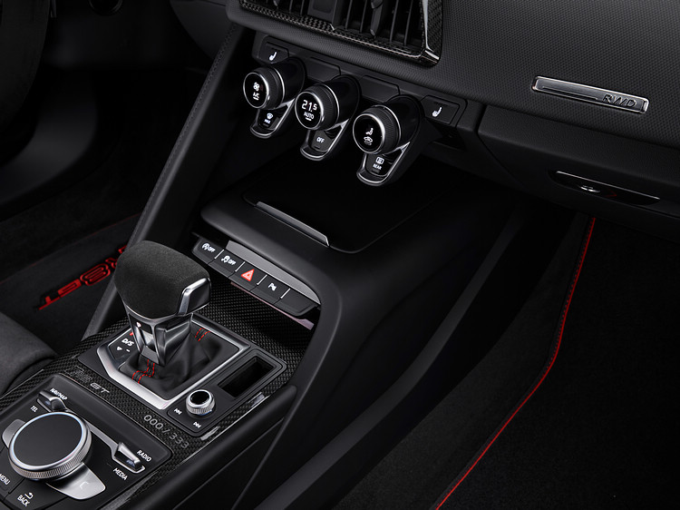 造成性能如此猛爆的另一個原因,是它的7速雙離合器變速箱換檔速度更快,加上Audi Sport為它更換搭配不同的齒比,造成各檔位的車速更高,除此之外,這款車的進氣岐管還施以黑色處理,這也是有別於其他R8家族的獨有設計。