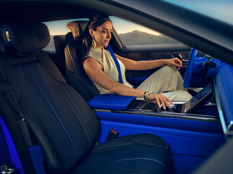 車室內裝在造型、材質與照明的運用上給人高層次的舒適感官體驗。車上有超過30個虛擬控鍵來操作車上的多功能座椅與空調系統來取代傳統的實體鍵鈕。方向盤與一些內裝細節是由3D列印。而影音資訊界面上更是毫不客氣,整個前方控台從左側到右側直接水平配置總計55吋的HD觸控螢幕,駕駛側的螢幕像素解析度更是相當於8K等級。副手座前方的螢幕在使用時會以數位方式屏蔽從駕駛者處望過去的亮度。確保副手座乘客的隱私。前方中控台配置了11吋觸控螢幕、後座中央配置8吋觸控螢幕、前座椅背則配置了12.6吋螢幕。