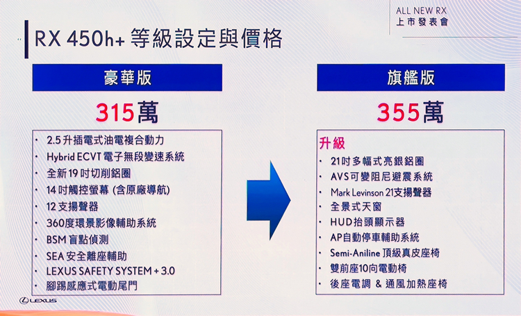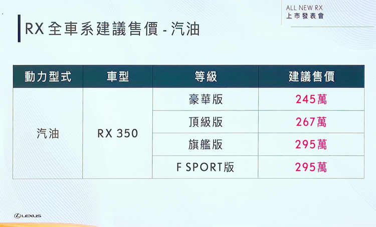 Lexus總代理和泰汽車於11月7日開始全新RX預售後,以4種動力10個等級的設定,全面攻佔豪華休旅市場,並吸引大量消費者下訂,累計訂單已破兩千張,而總代理和泰汽車也在11月23日舉辦上市發表會,並公佈正式售價。