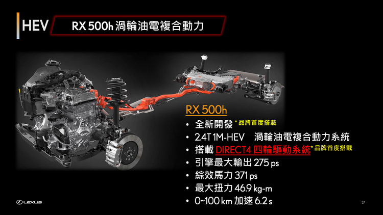 全新RX導入四款動力設定,其中三款為Electrified動力系統,展現品牌對於持續發展電動化車款之決心;其中包含搭載全新開發2.4升渦輪油電複合動力之RX 500h,可輸出達371匹綜效馬力,成為RX歷代以來最強動力之車型,搭配DIRECT 4電子式四輪傳動系統,可有效分配前、後輪輸出,提升車輛循跡穩定性,同時具備DRS後輪轉向系統,使車輛於低、中、高各種速域都能有最敏捷精準的轉向反應,打造最出色的性能與操駕表現。RX 500h將與首度導入RX車系之450h+插電式油電複合動力,以及350h油電複合動力,完整構築Electrified電動化動力陣容,提供消費者各式選擇。