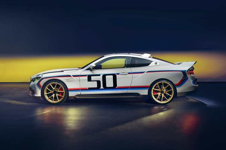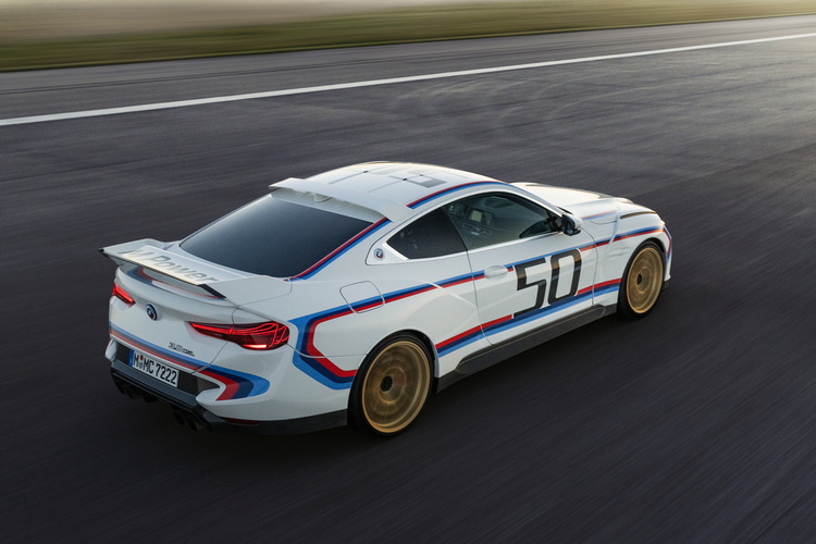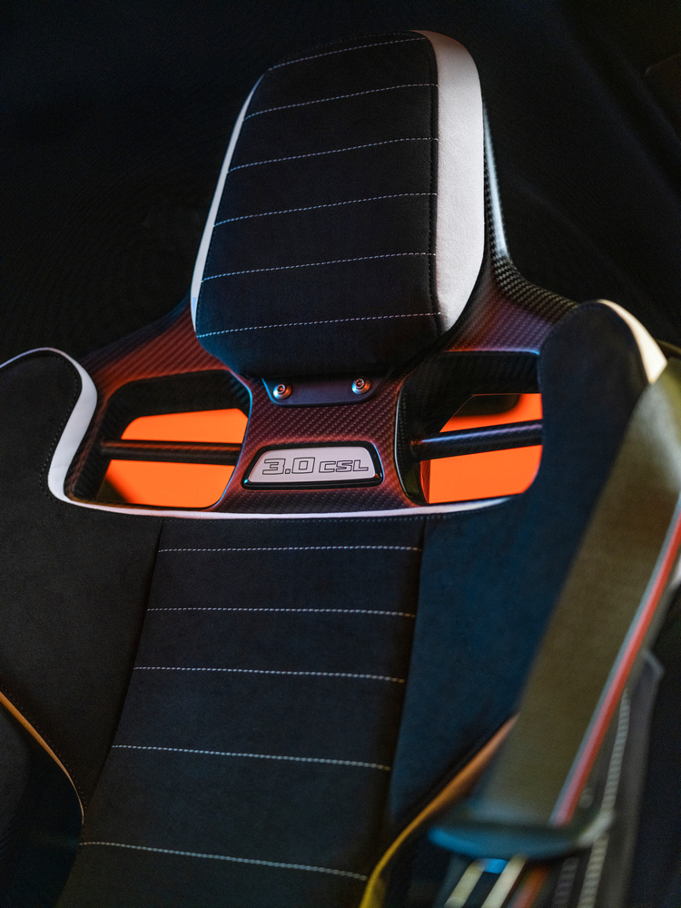 在Coupe的流暢車身線條與外擴的輪拱之外,3.0 CSL的空力件也相當吸引目光,如前下擾流與車頂及車尾的擾流翼等。輕量化的車體結構則是來自對於碳纖維與碳纖強化樹脂材質(CFRP)的大量運用,也讓它的馬力重量比達到2.9kg/hp。腳上則是配前:20吋、後:21吋鍛造Y形輻式樣輕量鋁圈,搭配與米其林共同合作開發的專屬輪胎。胎壁上也有「50」的字樣來凸顯這款M GmbH五十周年紀念的特別車款。