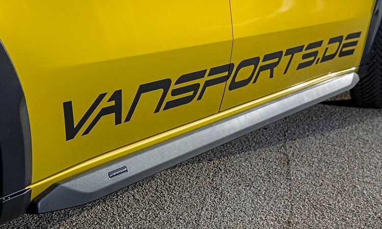 首先是黃色的Mercedes-Benz Citan使用了UrbanSportster風格套件,換裝上短彈簧可以降低車高約30mm,看起來運動風格更強烈。鋁圈更換19吋黑色雙輻式帶亮銀色樣式,車身也依照運動氛圍進行小幅度升級,像是前擾流板、側裙、車側貼紙等。