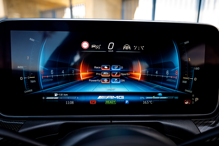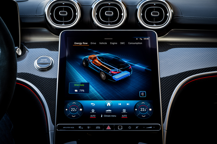 所搭載的「AMG high-performance battery」高性能鋰電池蓄電量為6.1kWh,滿電狀態下可讓車子純電驅動行駛13公里,純電驅動模式下的極速則為125km/h。