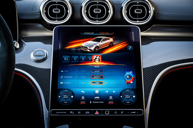 在電動渦輪的加持之下,這具2.0升引擎可輸出世界量產四缸引擎最強的476hp/6750rpm最大馬力與55.6kgm/5250-5500rpm最大扭力。加上配置於後軸、可輸出204hp馬力的電動馬達,整個插電式油電動力系統的綜效最大馬力達到680hp、最大扭力104kgm。搭配「AMG SPEEDSHIFT MCT 9G」雙離合器自手排變速箱與AMG Performance 4MATIC+四驅系統,0-100km/h加速成績3.4秒,極速被電子限速於250km/h。若選配「AMG Drivers Package」套件則可將限速值提高到270km/h。