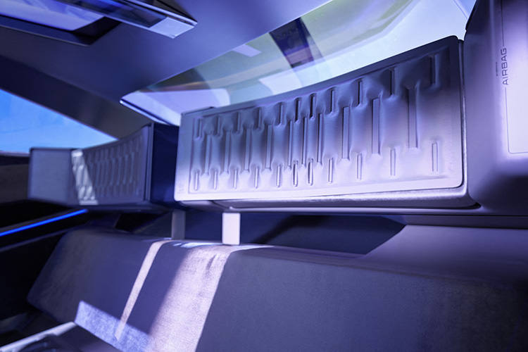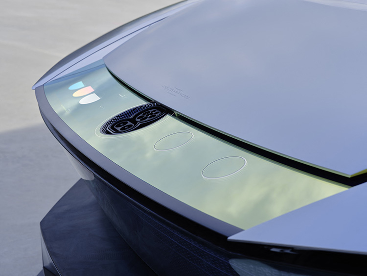 概念車在車門上安裝了一道橫貫整個車側的「TECH BAR」顯示裝置,會在駕駛或乘客接近或離去時,出現歡迎或告別訊息,還會顯示電量與其他資訊,而且由於具備AI識別駕駛的能力,可自行針對每位乘員偏好,調整出最適合的座椅、溫度、駕駛模式和多媒體設定。