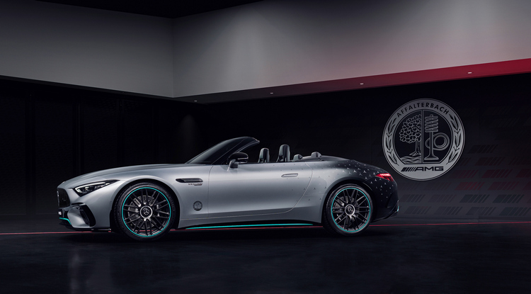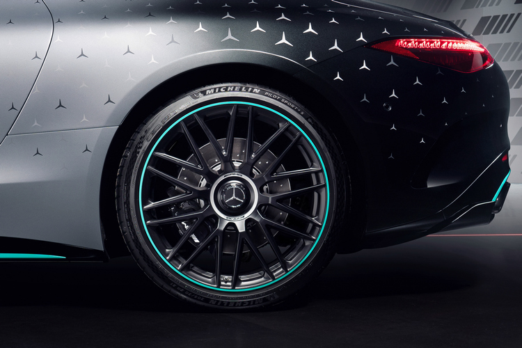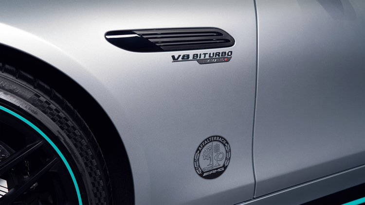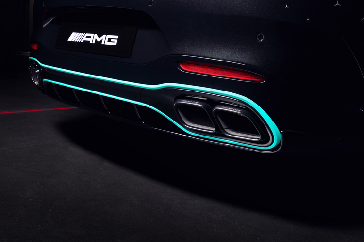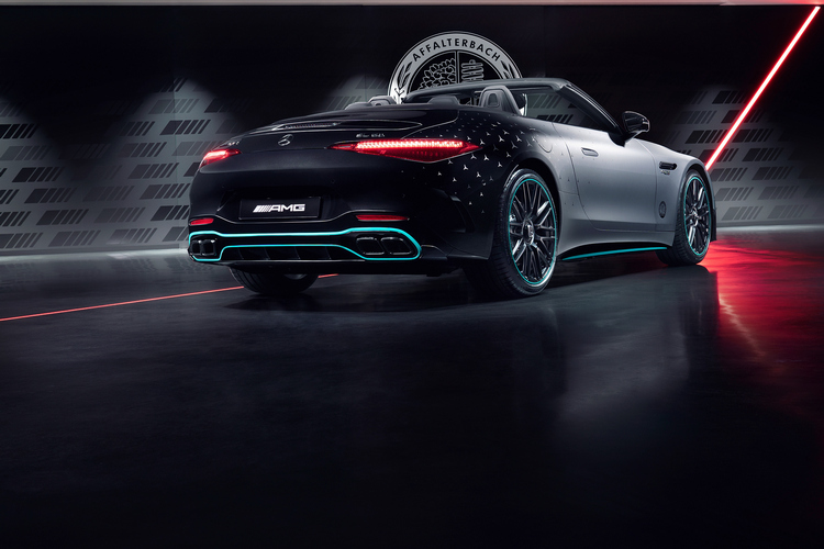這部特仕車在車身塗裝設計靈感來自F1 W13 E PERFORMANCE一級方程式賽車,從車尾的曜石黑金屬色漸層過渡至科技銀金屬色,車上還有許多「三星」廠徽來裝飾。腳上配備的21吋十輻雙肋消光黑鍛造輪圈上則加入了一圈代表PETRONAS的綠色來呼應。電動軟頂篷則是很有神秘感的黑色。整套AMG空力套件當然也是直接搬上身,包括前後保險桿上更大的導流翼片、大型車尾分流器、主動式車底氣流導引系統等來提升其空氣動力表現。
