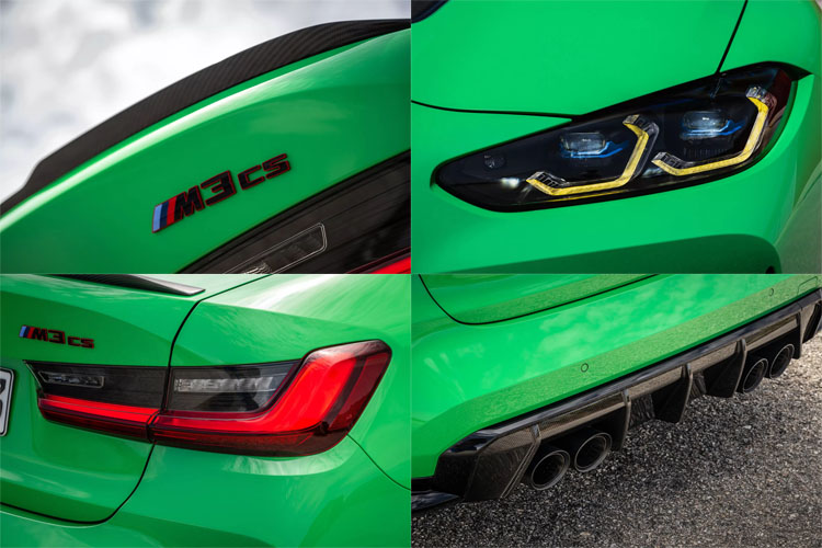 外觀與CSL相同,大量使用碳纖維材質,像是引擎蓋、車頂、後廂蓋,捨去雙腎型水箱護罩的主動調節功能。其餘減輕環節還有車內更換M Carbon桶型座椅,可選配陶瓷煞車系統以及20吋輕量化鋁圈、鈦合金排氣管,相較一般車型,M3 CS可減輕約20公斤左右,總重量約1,776公斤。