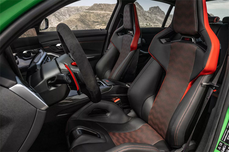 進到內裝,大量使用碳纖維材質,當然除了好看之外也有減重效果,除了碳纖維,也可看到大量麂皮材質包覆部件,兩者搭載一起營造出性能車該有的樣子。中控台使用12.3吋和14.9吋結合的曲面螢幕,並搭載最新iDrive車載系統。雙前座椅換上M Carbon可調賽車座椅,比起M4 CSL的桶椅,舒適性大大提升。保留後座位置,用以前座相同的材質、配色,坐滿四人依舊享有最大駕馭樂趣。