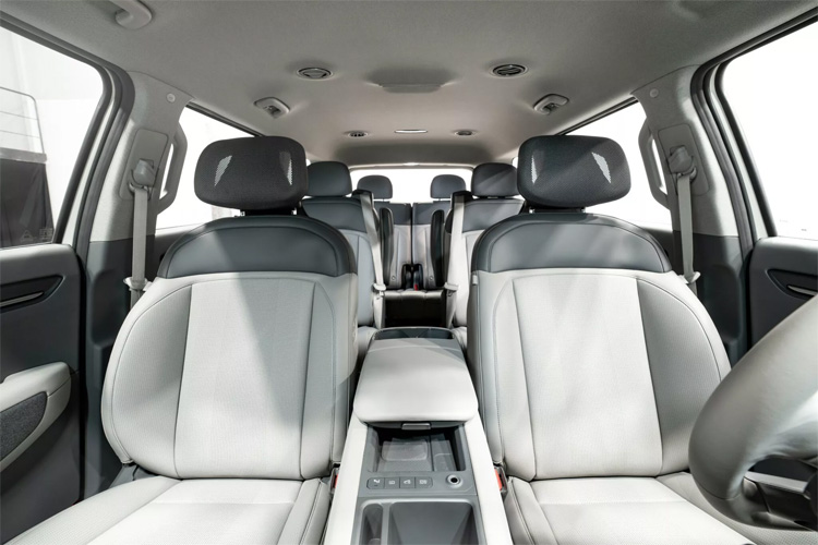 車輛內部最搶眼的就是第三排座椅,可以收折或者展開乘坐使用,座椅兩邊都有充電孔和置杯架。EV9有六座或者七座配置,兩者都提供相當舒適、寬敞的乘坐空間。如果選擇六人座配置車型,第二排可以選轉180度與第三排座椅面對面,這樣的配置會影響到腿部空間,但卻可以與乘坐者維持著良好溝通環境。