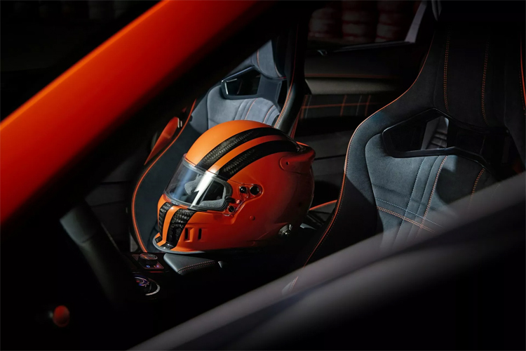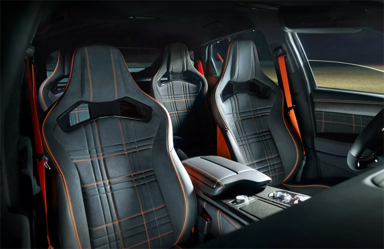 Genesis還針對GV80 Coupe Concept的內部進行了大膽創新的改造,以符合概念車該有的亮點。例如,方向盤進行了修改,表面採用了黑色Nappa和麂皮皮革,邊緣鑲有橘色裝飾和碳纖維飾條。SUV五座座位修改成四個獨立座椅,搭配四張桶形賽車座椅,靠背採用相同色調的橘色漆面碳纖維材料,第二排賽車座椅後方還裝有一個粗壯的車身結構桿。