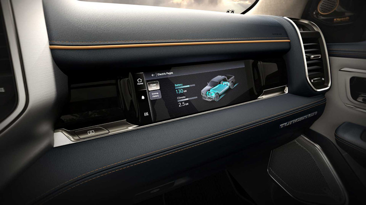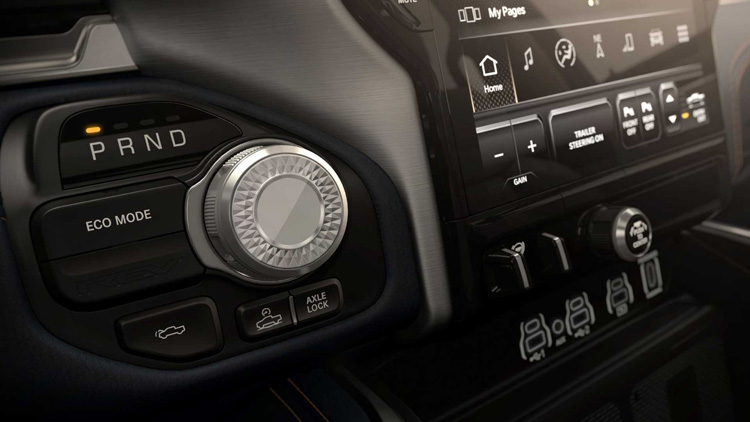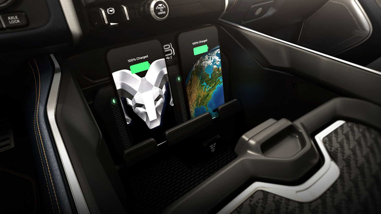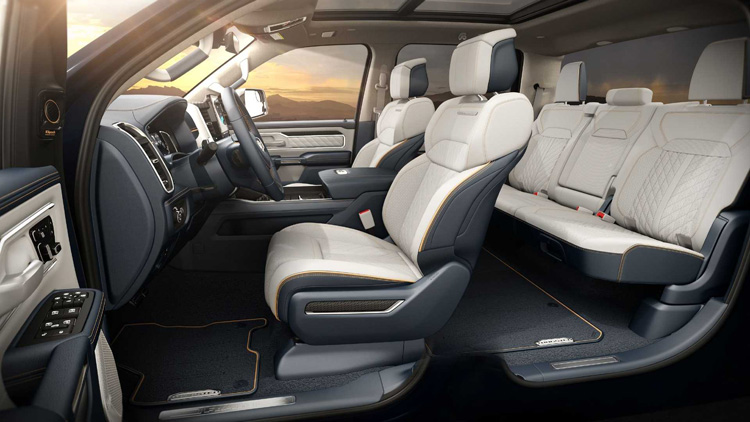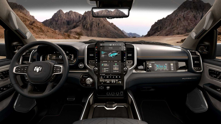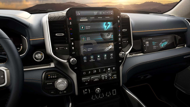 Ram 1500 打造了豪華皮卡的新標準,使用高級材質做為車內裝飾,像是碳纖維、金屬飾板以及真皮包覆。車內布局使用12.3吋數位儀表板,中間則有14.5吋娛樂觸控螢幕以及副駕駛前方10.25吋多功能螢幕。駕駛者上方還有10吋的抬頭顯示器,滿滿的螢幕營造出電動車的科技感。