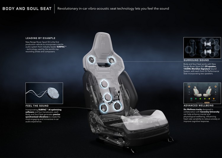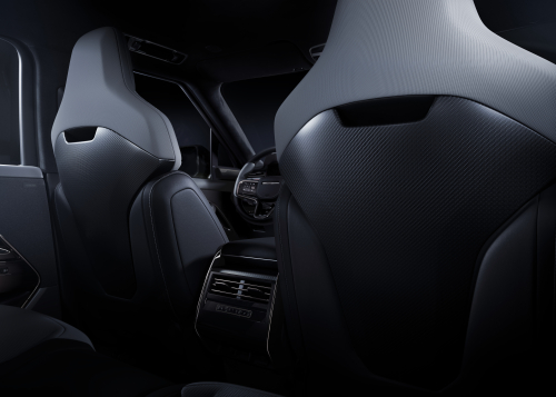 而在車室內,有著緞面碳纖椅背的SV Performance座椅與頭枕為一體化設計,下方還有發光的SV logo,側面支撐墊也更具立體感。車內可選新的PU超細纖維材質與3D針織成形纖維材質包覆內裝;方向盤後方配置世界首次採用的半透明邊緣自發光換檔撥片。黑色陶瓷材質的排檔頭也給人摸起來很酷的印象。所配備的Body and Soul Seat音頻震動座椅可感受音頻震動帶來沉浸式的音樂聆聽體驗,且可偵測乘客心跳頻率變化幫助了解與降低乘客的心情放鬆。