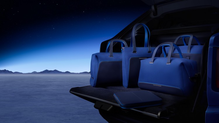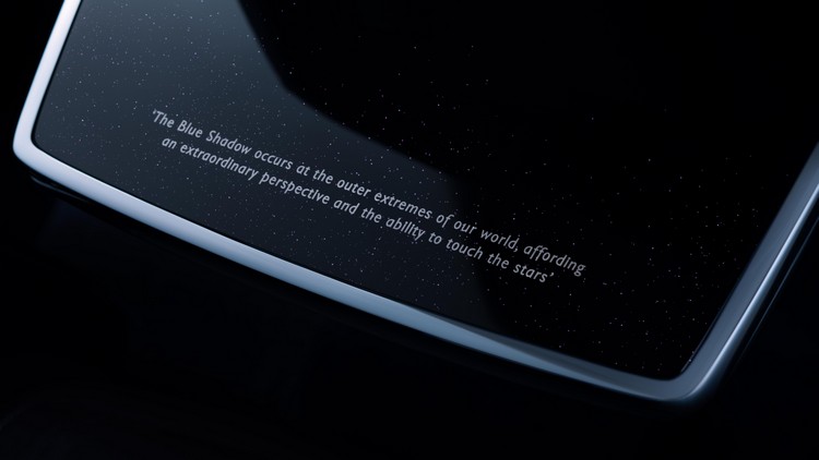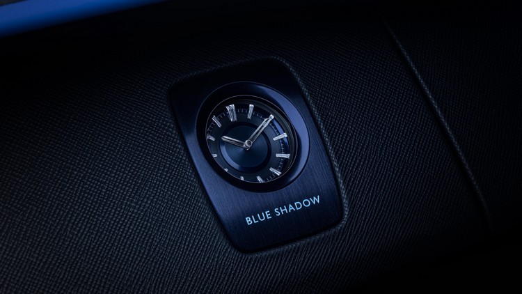 車室內控台飾鈑和車門飾鈑的獨特彩繪呈現出卡門線大氣層邊緣所呈現的空靈藍色光暈過渡至漆黑太空的氣氛。透過六層漆層將五種不同的藍色陰影與深黑色相結合,產生令人著迷的立體效果。而在最後潤色的透明塗層中則加入了藍色和透明玻璃顆粒來增加深度與光澤。前方控台上配置了收藏精品的客製化時鐘,其細部施以淺藍陽極處理且同樣刻有「Blue Shadow」字樣。
