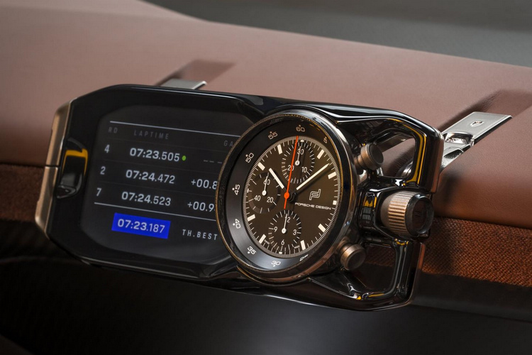 另一個內裝亮點,則是在乘客座一側的儀錶板內建有一套連接系統,可以接上碼錶模組。Porsche Design 為 Mission X 打造一款特殊的碼錶模組,同時具有類比與數位顯示,可用於賽道以及拉力賽,提供單圈時間或是其他重要的駕駛資訊。