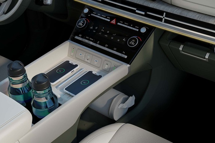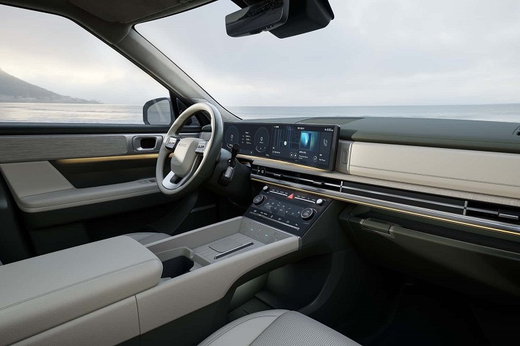 第五代Santa Fe具備長軸距以及大面積尾門設計,可為車主提供充沛的乘載空間,儘管未透露其內部空間有多大,但從照片中能得知,如果摺疊第二排與第三排座椅,絕對是同級距中最大置物空間之車款。硬派、強悍的外觀風格並延續至車內,以橫向溝通為整體設計概念,看不到圓弧的線條。車內的設計相當精緻,首先就是看到兩個12.3吋螢幕所組成的曲面螢幕,使用木紋和皮革包覆車內飾,提升整體視覺奢華感。