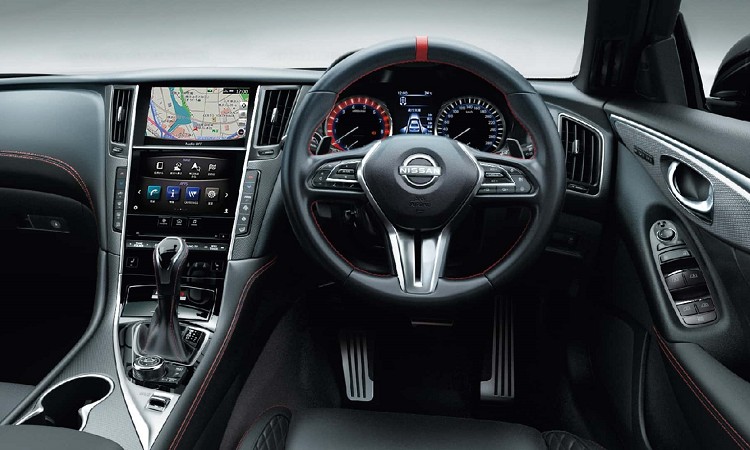這輛名為Nissan Skyline四門轎跑車,在台灣則是被稱之為Infiniti Q50。經過Nismo原廠改裝品牌升級強化後,外觀相當帥氣,換上全新樣貌水箱護罩,車身四周安裝下巴、側裙等配件,對於四門轎車有著加分效果;車尾類似F1樣式的後霧燈,搭配上左右單出排氣管,從車尾望去便知道他非善類。鋁圈升級更輕、更寬、更堅固的19 英寸 Enkei框,換上較寬的後輪尺寸,提升輪胎與地面抓地力,同時升級制動系統來令片與重新調校ABS系統,大大縮短煞車時的距離。
