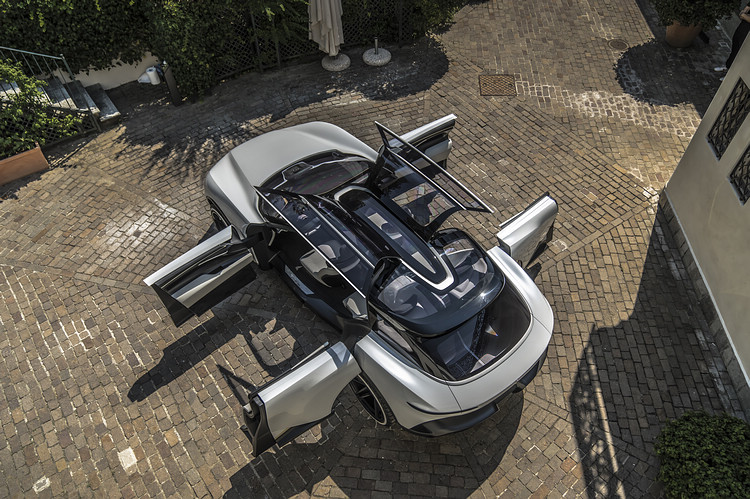 車窗向上合攏,結合無框車門和後接式後門,讓駕駛者或是乘客上下車得以更為便利,內部則是採用寬敞的 2+2 座椅配置。外觀還能看見更多細節,譬如環繞玻璃車頂的陽極氧化鋁環形線,車頂天窗兩側也有鋁製飾件用以突顯輪廓,至於車身前方則配備數位鏡頭以取代傳統的後照鏡,背面則有 PURA Vision 紋飾。