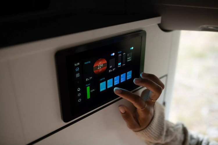 上層的車頂床位使用電子操作,透過電動馬達就可輕鬆操作;頂不外層安裝太陽能電池板,大太陽時可以幫車內電池充電,用於休閒活動使用。駕駛座前排加熱座椅可以旋轉180度,就能與後排桌子和椅子結合,打造出生活、飲食或者工作區域。