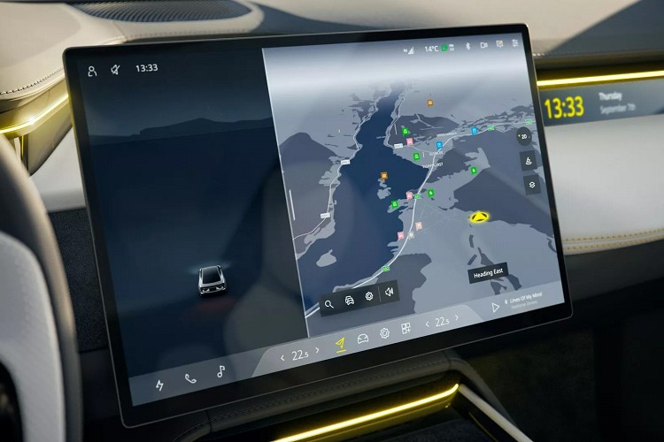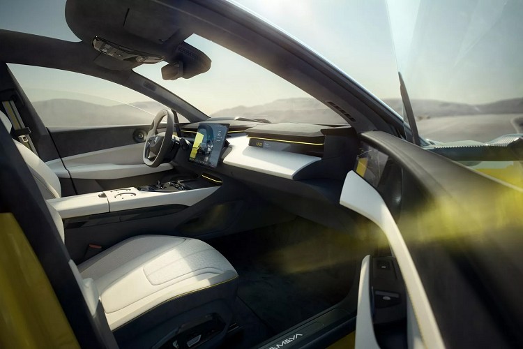 進到車內,Lotus僅提供一些概略訊息,從照片中可以看到一個極簡的內裝設計,配備四張獨立座椅,未看到在先前間諜照中的後排標準型座椅,也就表示消費者可以選擇標準座椅或者獨立座椅。駕駛者前方使用平把式方向盤和一個小型的數位儀表板,中控台設一具懸浮式娛樂觸控螢幕,看起來與Tesla也點類似,公司並未提供具體尺寸,大膽推測與跨界車型相同,尺寸使用15.1吋。