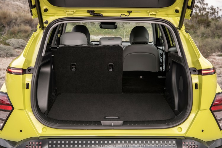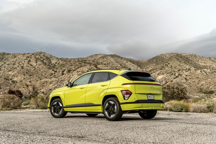 新Kona Electric的前方風阻係數為0.27,車身造型折線複雜,尤其時輪拱附近的線條與車門把手高度的肩線。車尾則以水平貫穿車尾的LED光條搭配下方多道水平的造型切線來統一視覺感。頭尾燈則都導入了像素化的設計。