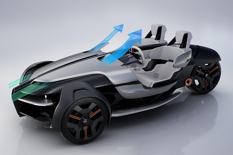 概念車採用開放式結構,沒有車門,同時提供並排座椅的配置,擋風片的尺寸雖然不大,行進間的氣流仍可透過車頭特別設置的導流通道,在衝擊人體之前就進行導引加以排除。