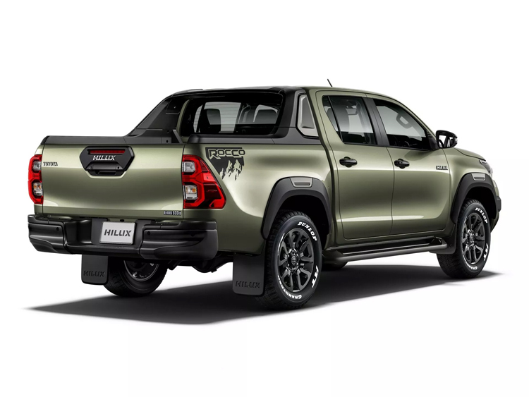 全新特仕車Toyota Hilux Revo Rocco擁有專屬套件,首先在外觀上,針對前後保桿小幅度修飾,看起來更加堅固,獨特的水箱護罩,兩側則有配備LED頭燈的金屬飾條。車側獨特輪拱黑色塑料材質,上下車有金屬登車踏板;車底安裝防撞護板,越野時能避免碰撞損傷。位於車尾處有Rocco特殊彩繪,貨斗特別材質包覆減少刮傷,還有照明輕鬆拿取貨物。貨斗尾門特殊機構,有緩降功能,開啟或關閉較為省力。