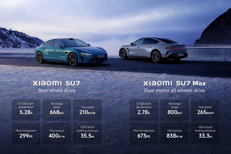 首批車型提供SU7和SU7 Max兩種車型,採用寧德時代101kWh麒麟電池系統,分別搭配自行研發製造的V6後軸單馬達及V6s前後雙馬達系統,續航里程為668km(CLTC)與800km(CLTC)。