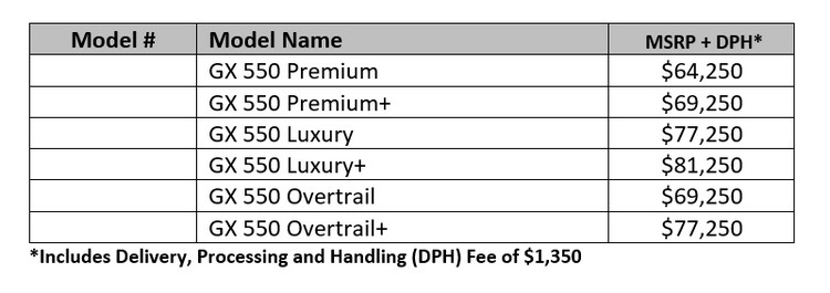 新GX在車系編成上共有六個車型,包括原本的Premium、Premium+、Luxury、Luxury+ 與新追加、更為越野取向的Overtrail和 Overtrail+車型。
