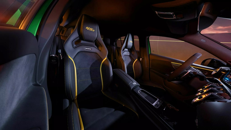 座艙內維持AMG A45戰鬥氣息,運用旗艦配備Artico人造皮革和Microcut微纖維包覆雙前座賽車椅,邊條縫上黃色是條點綴,就如車身外觀的黃色彩繪。其餘還有黃色縫線、黃色氛圍燈等,以及碳纖維飾板打造強烈運動化內裝氣氛。