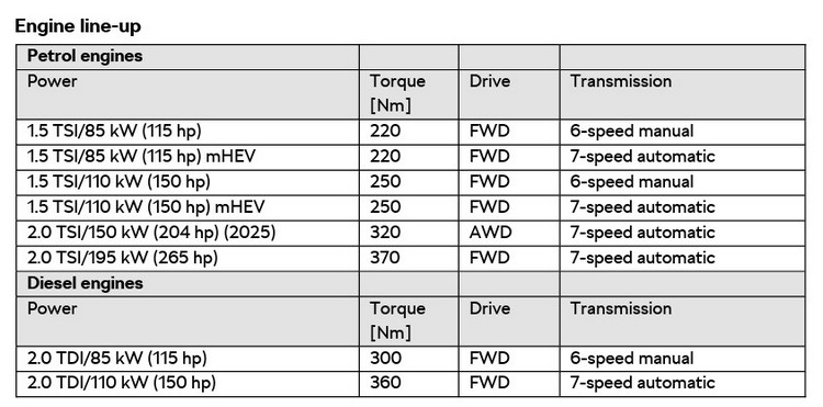 新Octavia在動力上共有五款動力單元的選擇,最入門的1.5 TSI汽油引擎提供114hp最大馬力輸出搭配六速手排或七速DSG雙離合器自手排變速箱,該引擎也有147.5hp最大馬力輸出的版本,且搭配DSG變速箱的車型均為輕油電系統設定。 再來是2.0 TSI汽油引擎,可輸出201hp最大馬力搭配自排變速系統與四驅設定,頂規的RS車型則擁有261.5hp最大馬力搭配DSG變速系統。在柴油部分則是兩款2.0 TDI引擎,114hp最大馬力版本搭配六速手排變速箱,147.5hp最大馬力版本則搭配七速DSG。