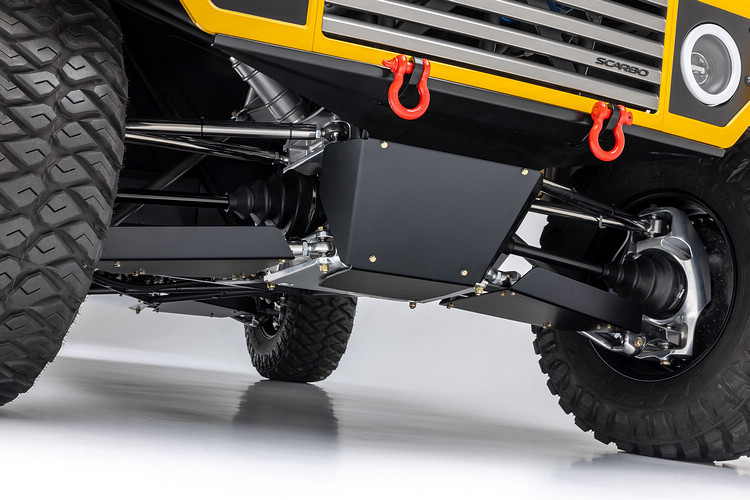 為提供極限落差跨距需求,這款車的前後懸吊都是採用推桿式結構設計,使得懸吊行程長達76.2cm,同時標配車高可調控制及阻尼可調氣壓避震器。車輪搭配的是40吋越野胎和20吋鍛造輪圈,加上Brembo 6活塞煞車卡鉗與400mm碳陶瓷碟盤,整體底盤配置可謂一步到位。