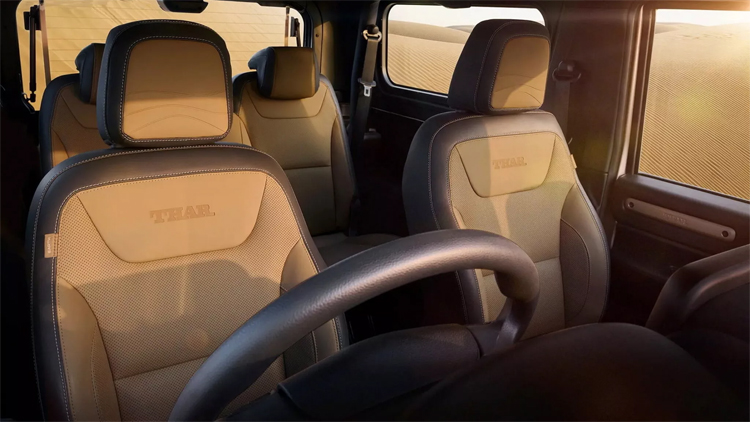 從外觀來看,Mahindra Thar Earth Edition有專屬“Desert Fury” 消光沙色,結合側面彩繪、黑色Mahindra標誌,以及B柱上特別的Earth徽章,營造出美軍沙漠使用軍車的氛圍。此外,水箱護罩格柵也與車身同色,並結合黑色邊框形成強烈對比。與Thar的其它版本一樣,這款特別版車型配備18吋鋁圈以及全地形輪胎。