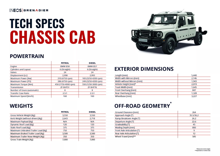 與其它Ineos Grenadier家族的車型一樣,底盤貨車搭載來自BMW的3.0升六缸渦輪增壓汽油或柴油引擎,以及搭配ZF的八速自動變速箱。額外還擁有重型實心樑軸、雙速分動箱和多達三顆差速器鎖,使其在崎嶇的路面上輕鬆穿越、暢行無阻。