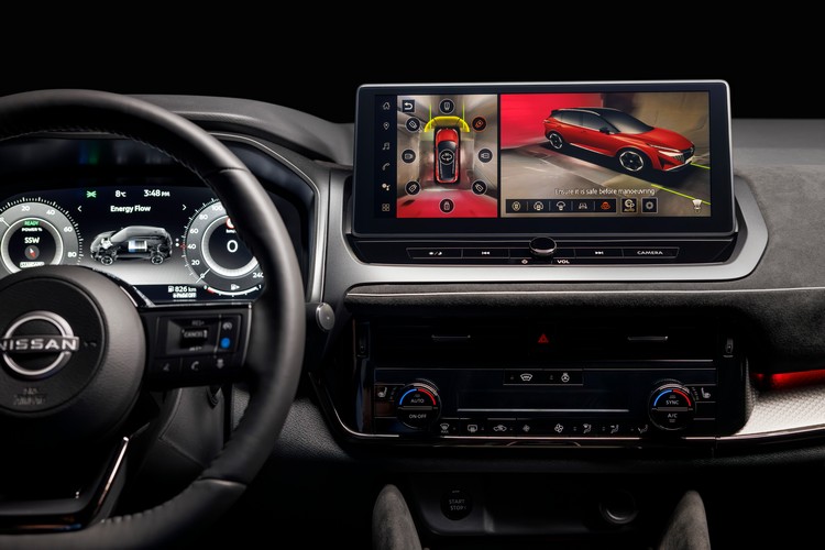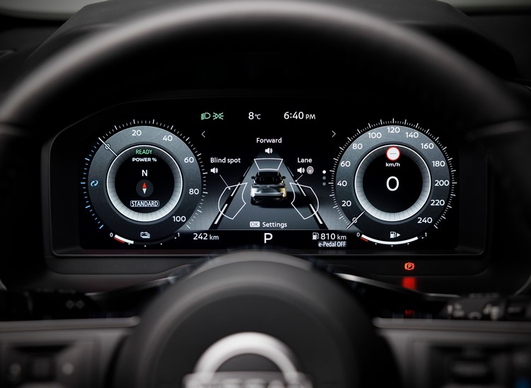 升級後的AVM環車偵測顯影功能現在具有3D功能,不僅可以從上方看到汽車,還可以選擇八個不同的外部攝影機視點之一,從前面、後面、側面或角落可視化汽車,從而可能辨識任何看不見的外部危險。它與日產的移動物體偵測系統連動,當感知到附近有移動物體時系統會發出警報。