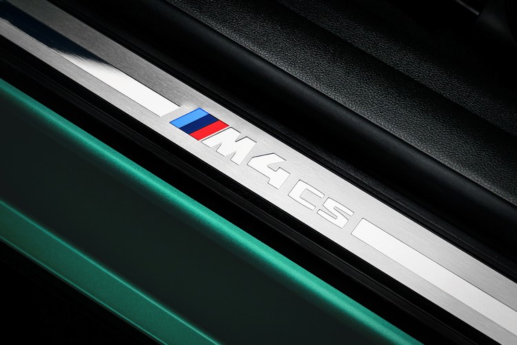 車內標配 M Alcantara三輻平底方向盤,上面有著紅色的中心標記與CFRP材質換檔撥片;標配的M碳纖維桶形座椅也在椅背和椅墊的內部結構組件中使用了CFRP材質。座椅以Merino皮革包覆並採紅/黑配色。車內前後門內側均以黑色皮革包覆,中控台上有紅色的「CS字樣」搭配車上的碳纖維飾板與刻有「M4 CS」字樣的門檻飾板都為車內增添了獨特的氛圍。