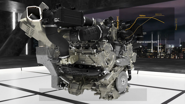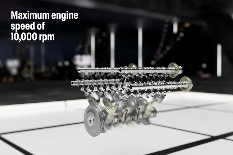 位在兩排汽缸之間則設置350bar中央直接噴射供油系統,並且採用和高性能摩托車相同的側邊搖臂式汽門機構;同時,兩組渦輪機置於汽缸夾角之間,也能達到更好的熱能和流體管理效率;至於乾式油底殼設計,則是確保極端離心力駕控下仍能提供最佳潤滑。