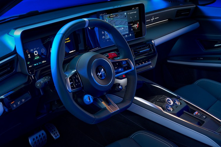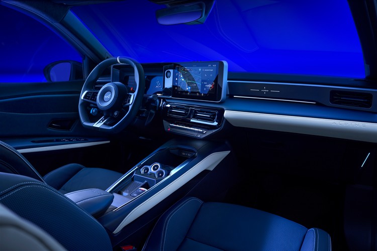 前方控台採用頂級Nappa皮革包覆,中控台上10.1吋中控螢幕與駕駛者間有一定的面對角度,鑰駛槽上有阿爾卑斯「雪花」紋理。具有加強側面支撐的座椅採用粒面塗層織物(15% 再生塑料和大麻纖維)與深藍色 100% 再生織物相結合,搭配矽灰色對比縫線。控台上部。儀表板、和門板均採用粒面塗佈織物填充。
