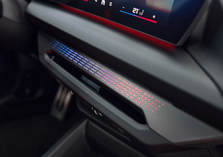 車室內裝標配完全不含皮革,但可選配Veganza/Alcantara包覆材質。由銑削鋁製成的動態背光飾板同樣營造出汽車精緻且運動化的高級氛圍。曲面中控螢幕與新設計的換檔介面則凸顯了車內的科技感。