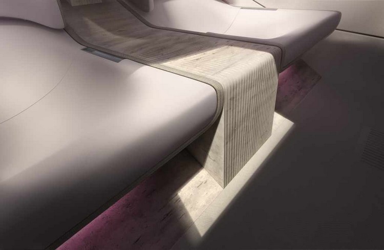 打開車廠稱之為蝴蝶式的車門後,就可以看到充滿現代主義感的車室內裝。車內共有三條手工製作的簧銅線貫穿車室,其中中央3.2m 長的黃銅脊柱,將前方控台的量個浮動儀表板分開。舒緩的石灰華石支撐著浮動座椅和中央脊椎。織紡織品增添了工藝感。類似手工編織紗線觸感的羊毛混紡面料包裹著兩個座椅、音箱和地板。