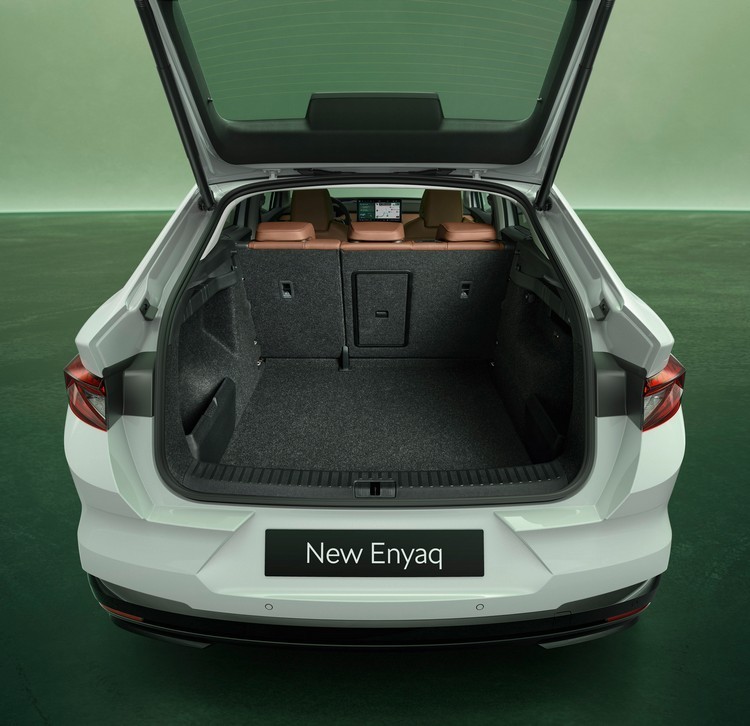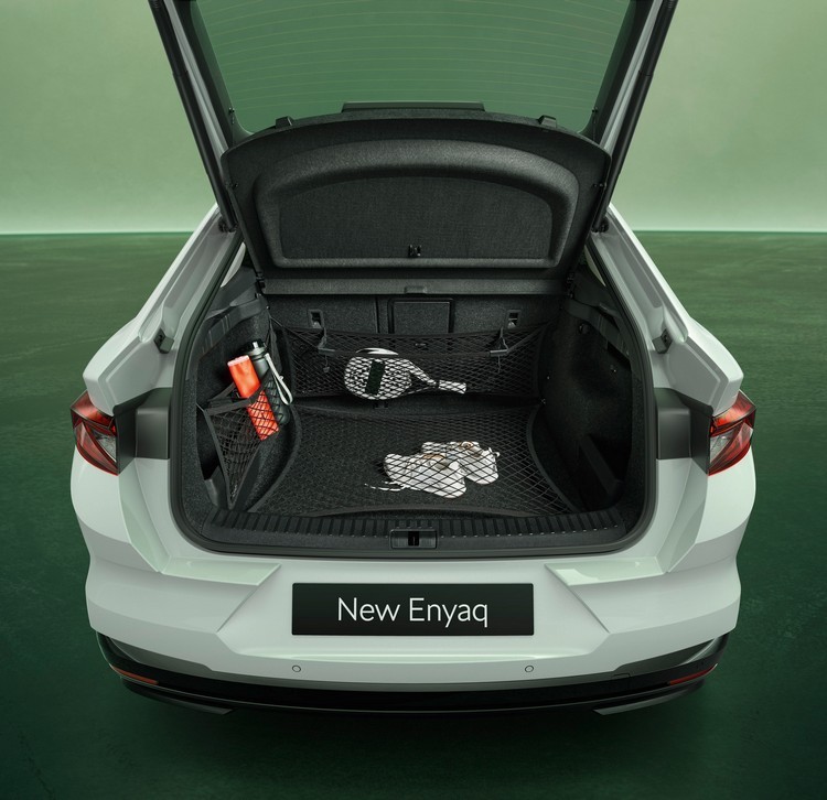 新Enyaq車內標配5吋數位儀錶與13吋中控台資訊娛樂顯示螢幕,方向盤也將電熱功能列為標配。其他像具有接近自動解鎖、離車自動上鎖功能的免匙鑰匙、前座電熱功能、三區恆溫空調與適用各車型的拖車勾。品牌一向標榜的Simply Clever功能當然也沒少,例如行李廂上的QR Code、刮冰器、輪胎花紋深度計整合至行李廂蓋、車門的雨傘收納空間及前排座椅椅背的手機袋等。前後座也都有45W功率的USB-C快速充電插孔。行李廂容量為585至1710公升,Enyaq Coupe則為570至1610公升。