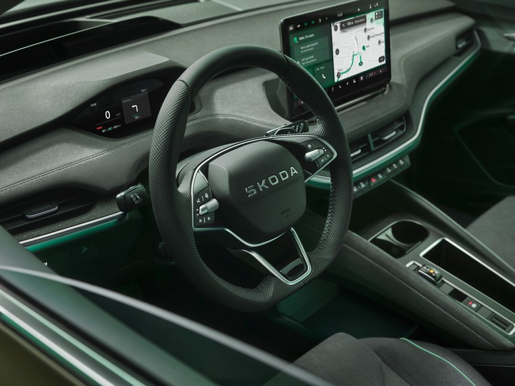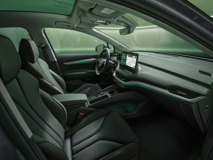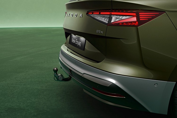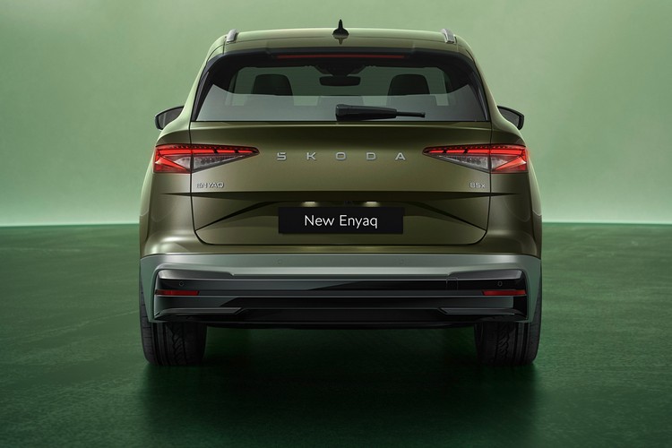 新Enyaq的黑色Tech-Deck是車頭吸引目光的焦點,雷達與前置攝影機等感測裝置都隱藏於其中。引擎蓋中央以深色鍍鉻合金的SKODA字樣取代廠徽與車尾相互呼應,前後保桿上的嵌飾條也是如此。Tech-Deck上的LED照明會展演回家/離家動畫,下方則是矩陣式LED頭燈。尾燈為經典的「C」字形且有兩個版本,頂規版多了動態方向燈並將尾燈整合至回家/離家動畫中。