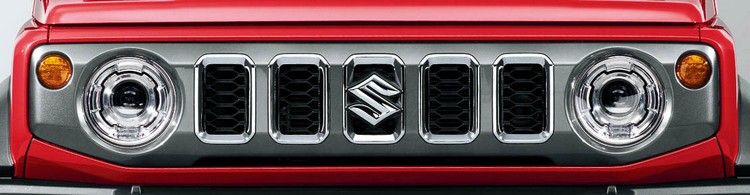 外觀上,在Jimny的車頭重要特徵五孔式直柵水箱罩施予槍灰色金屬電鍍塗裝,直柵邊框也有做電鍍處理來提升質感。保桿與輪拱等護件則是無塗裝塑料材質來保護車身鈑件不被跳石與泥濘損傷。造型方正的車身有助駕駛者掌握車身與周圍環境的相關角度,在惡劣地形環境下更能避免危險,連前後保險桿的造型也考量到了有利於克服越野路況。