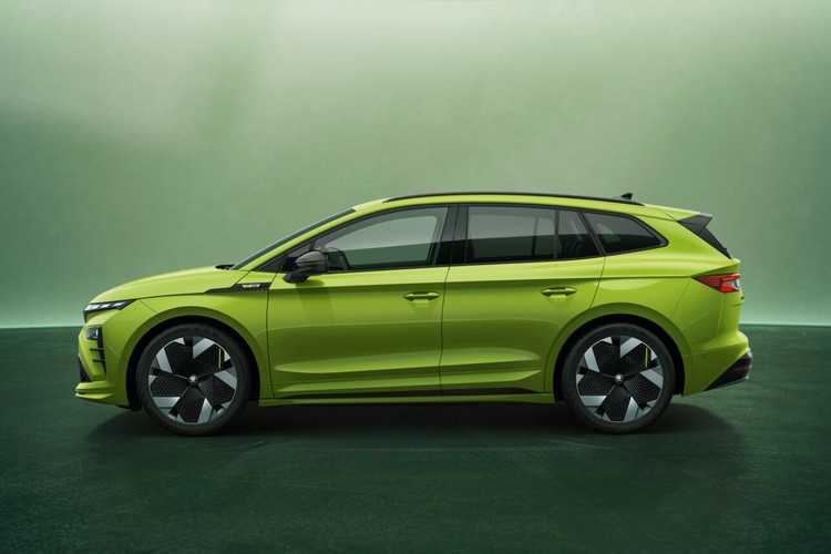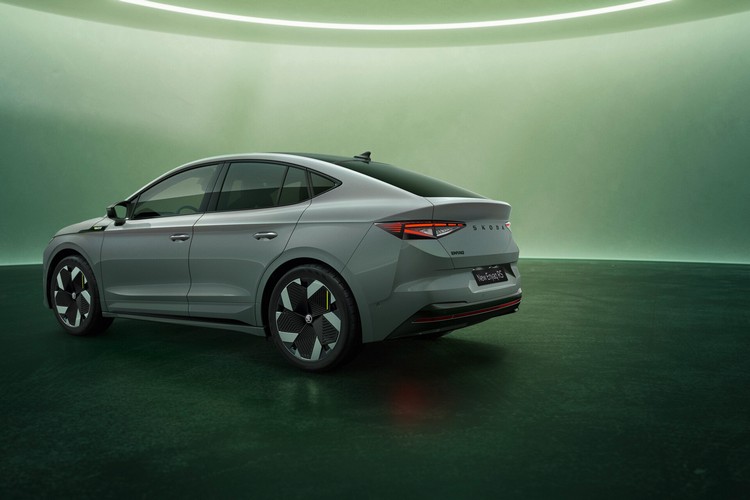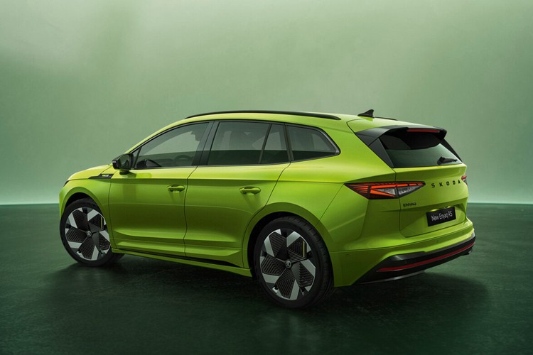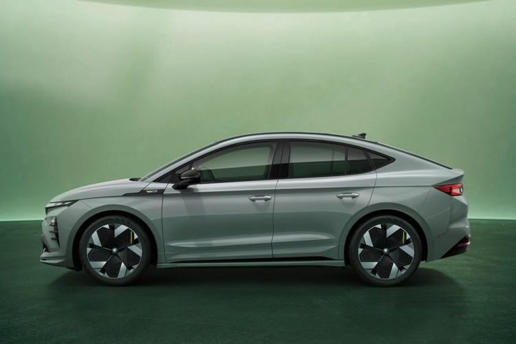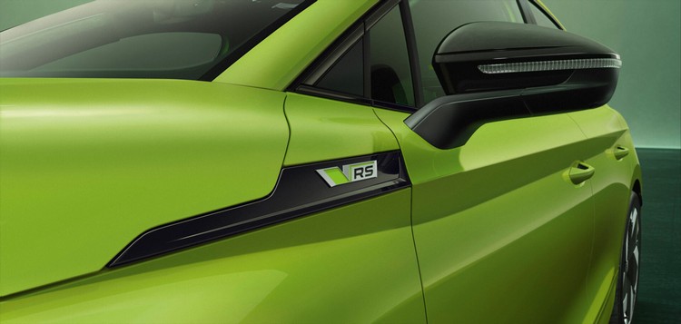 RS的視覺重點就在於黑色塗裝件,例如側窗飾條、車頂行李架、前後保桿的車名字樣以及後視鏡蓋。輪圈標配20吋有著消光黑飾板Draconis式樣,並提供21吋的Vision 式樣。前側隔音窗採用夾層玻璃來降低車內噪音。而在空力性能表現的提升下Enyaq RS 的風阻係數Cd值為 0.251、Enyaq Coupé RS則為0.239。