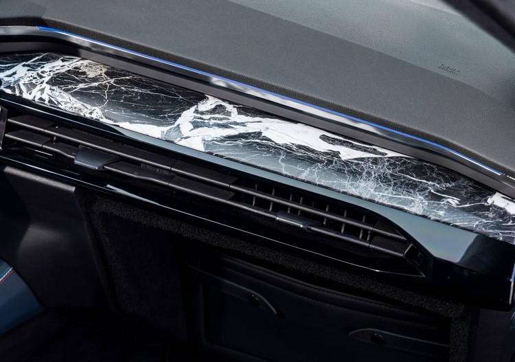 車室後座設計成行動辦公室,採客製化佈局,兼顧功能性與人體工學。特別著重於乘客的冷熱舒適與聲學舒適,透過改善隔音效果和優化空調系統確保車內維持舒適溫度。車室內裝在設計師們在精挑細選下,採用了汽車界罕見的材料——來自庇里牛斯山脈、帶有白色紋路的黑色大理石。這些大理石被精確地鑲嵌在總統座車的後座中央扶手、儀表板和方向盤中央。後座控制面板的飾板採用深色山毛櫸木搭配鑲嵌細工飾面。手工打造飾面的自然溫潤優雅地平衡了大理石,展現了法國工藝的卓越。