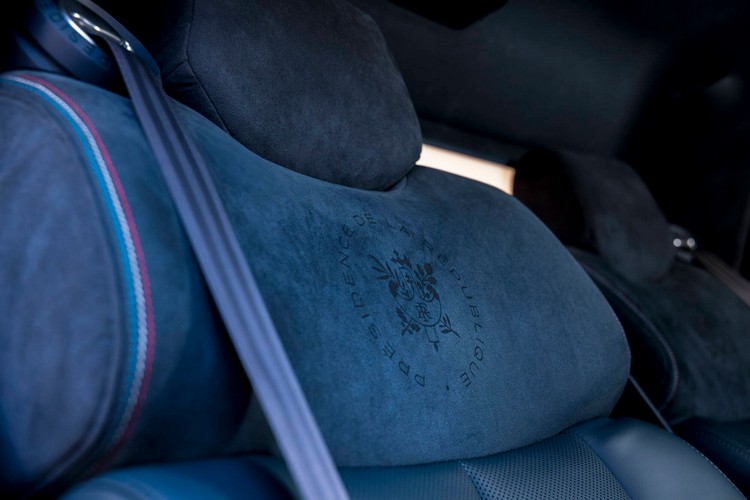 皮革選自精選的邊角料,並重新加工成特定顏色,而藍色縫線則經過精心挑選,以符合法國的官方色卡。 頭枕上精緻的雷射雕刻呈現法國國徽:一個飾有束棒、橡樹和橄欖枝的盾牌。前排座椅背後有隱密實用的地圖袋可放置乘客的隨身物品。