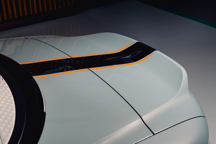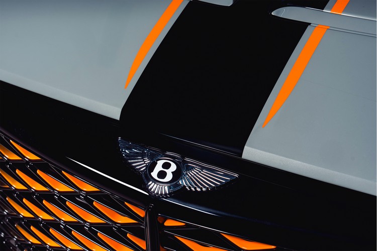 具體來說,閃爍的蛋白石銀色外觀,被一道黑色亮面 Batur 賽車條紋一分為二,兩側則飾有橘色細條紋。這條彩繪的特色賽車條紋無縫地融入車身,從水箱罩開始,向後延伸至引擎蓋和駕駛艙,然後繼續沿著延伸至後方Bentley 飛翼徽章。